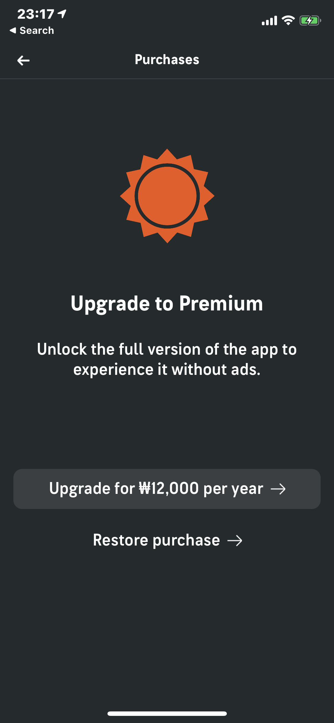 웨더 메이트 프로는 5,900원(4.99달러)에 구매할 수 있는 유료 버전이다. 일주일, 한 달, 일 년 단위로 결제하는 구독형 모델이 아니다. 처음 구매할 때 한번 결제하는 것으로 끝나기 때문에, 비슷한 기능의 유료 날씨 앱과 비교하면 훨씬 경제적이다. 그리고 가격 자체도 비교적 저렴한 편이다.