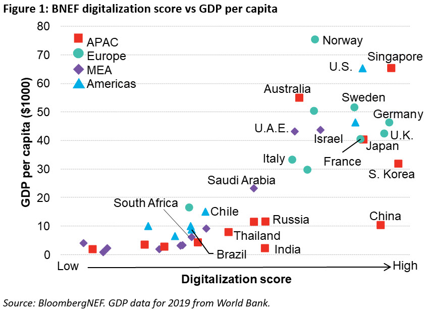 국가별 디지털화 순위와 1인당 GDP. 지난 해 3위를 기록했던 한국이 올해는 1위로 올라섰다. (자료:BloombergNEF)