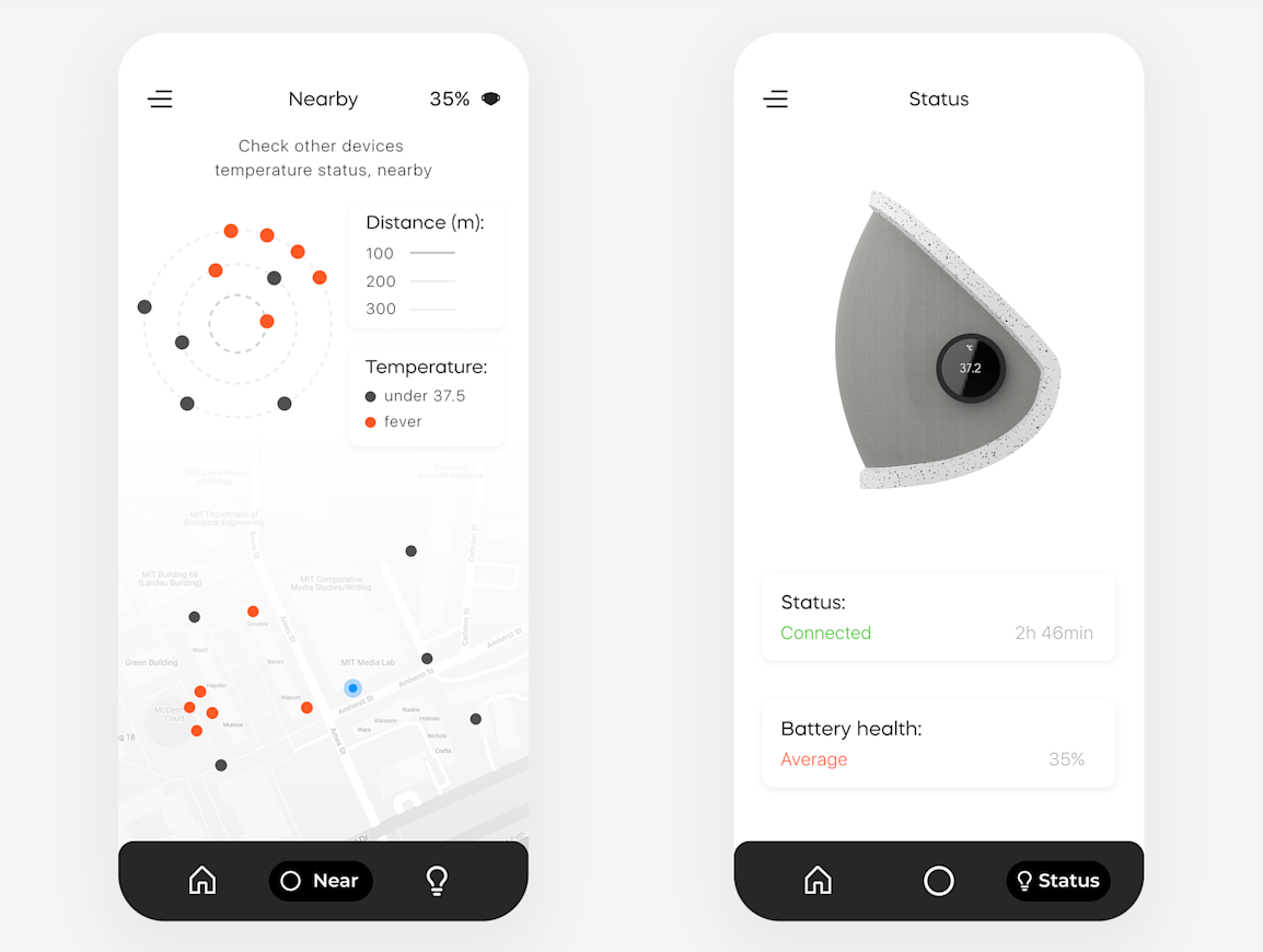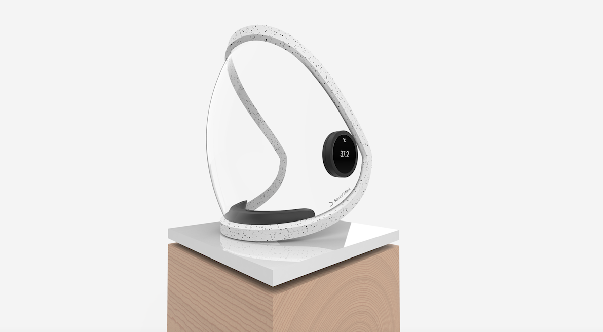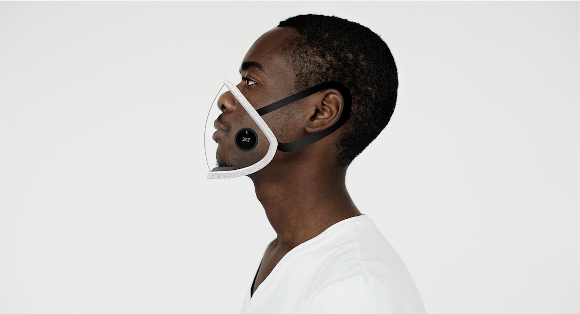 MIT 펜대믹 대응 프로젝트에서 수상작으로 선정된 소셜 마스크는 투명한 폴리카보네이트 또는 폴리프로필렌 등의 소재로 만들어진다. 본체에는 먼지, 바이러스, 세균, 체온 등을 측정할 수 있는 센서가 탑재되고, 블루투스와 스마트폰으로 연결한 후 앱에서 이를 확인하고 경고를 받을 수 있다. (사진:www.burzo.design)