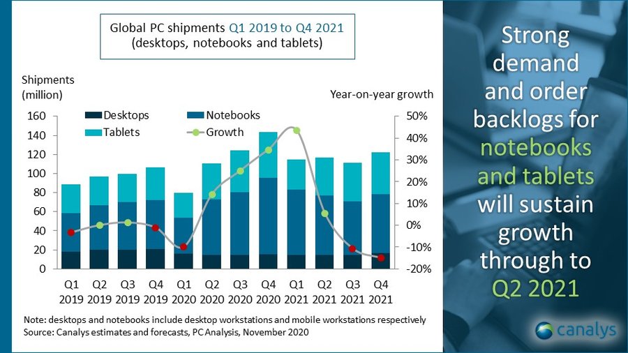 카날리스는 "숙련된 작업자와 학생을 위한 개인용 컴퓨팅 장치에 대한 수요가 상당한 공급 증가에도 불구하고 전례없이 높은 수준이다. 2021년 전체 PC 출하량은 PC 시장에서는 특별한 해였던 2020년보다, 약 1.4% 더 성장할 것으로 기대된다"고 밝혔다.