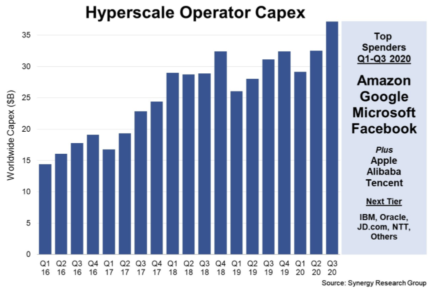하이퍼스케일 사업자(Operator)가 설비투자(Capex) 등에 사용한 자본지출 규모가 2020년 3분기 동안 370억 달러를 넘어서며 분기별 지출 규모 면에서 새로운 기록을 달성했다. 2020년 1분기부터 3분기까지 자본지출은 총 990억 달러로 거의 1,000억 달러에 육박하는 것으로 나타났다.