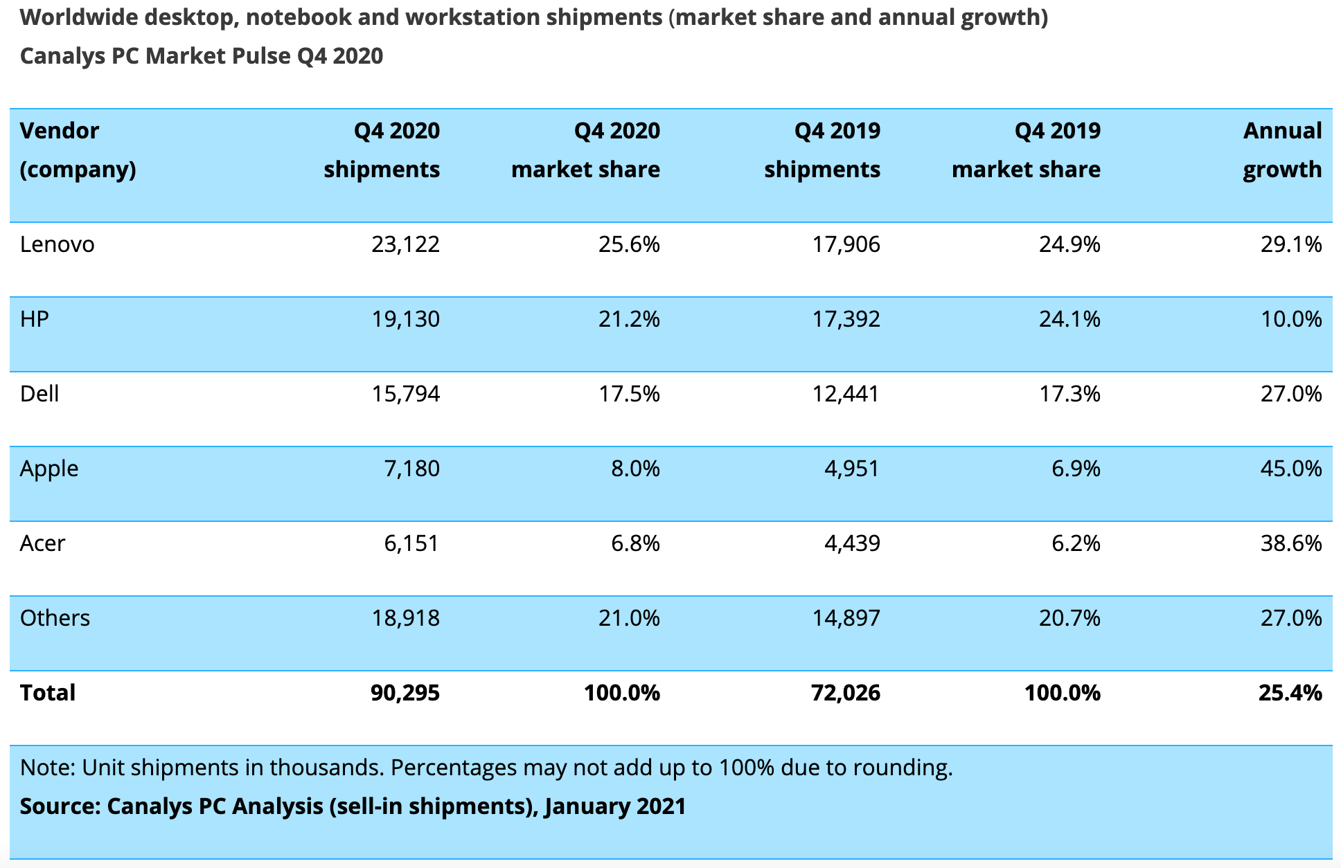 2020년 4분기 PC 시장 ; 레노버 25.6% 점유율로 1위, 연간 성장률은 애플이 45%로 1위