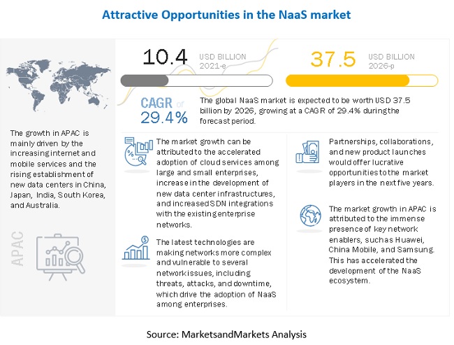 서비스로서의 네트워크(Network as a Service) 시장 규모가 2021년부터 2026년까지 29.4%의 연평균 성장률을 기록할 전망이다. 시장규모는 2021년 104억 달러에서 2026년에는 375억 달러로 성장할 것으로 예측됐다. 최근 들어 기업에서 클라우드와 새로운 IT 기술을 채택하는 사례가 늘어나면서, 네트워크 인프라에 대한 설계 및 설정 방식의 변경 필요성이 증가하고 있는 것이 성장 요인으로 지목됐다.