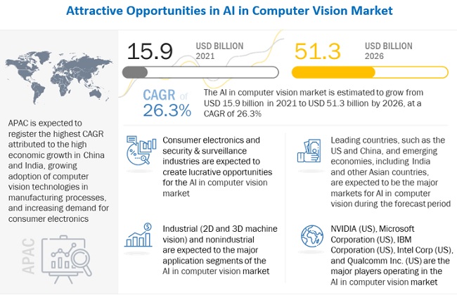 마켓앤마켓이 "2026년까지 컴퓨터 비전 시장의 AI(AI in Computer Vision Market, Global Forecast to 2026)" 보고서를 발표했다. 보고서는 컴퓨터 비전 관련 산업을 구성 요소, 기계 학습 모델, 응용프로그램, 최종 사용 산업, 지역 등으로 나누어 조사를 진행했다. 컴퓨터 비전이 인공지능 시장에서 꾸준한 성장세를 유지할 것으로 전망했지만 클라우드 기반 이미지 처리 및 분석에서의 보안 문제는 성장을 제한하는 요소라고 지적했다.