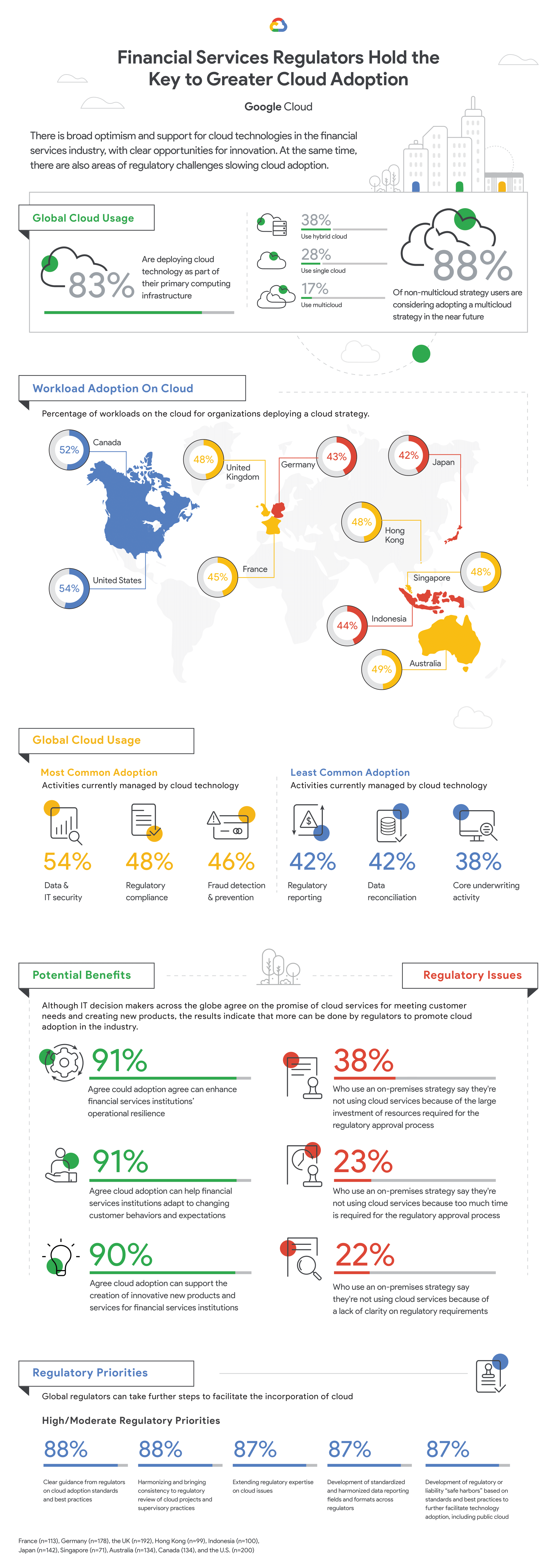이러한 상황에서 구글이 실시한 이번 조사는 금융 서비스와 관련 기업들이 관심을 가져 볼 만하다. 구글은 금융 서비스에서 클라우드 도입 과제와 기회를 더 잘 이해하기 위해, 해리스 폴(Harris Poll)과 함께 조사를 진행했다고 밝혔다. 이번 조사는 미국, 캐나다, 프랑스, 독일, 영국, 홍콩, 일본, 싱가포르, 호주의 금융 서비스 업계 리더 1,300명 이상을 대상으로 설문조사를 진행하는 방식으로 실시됐다.