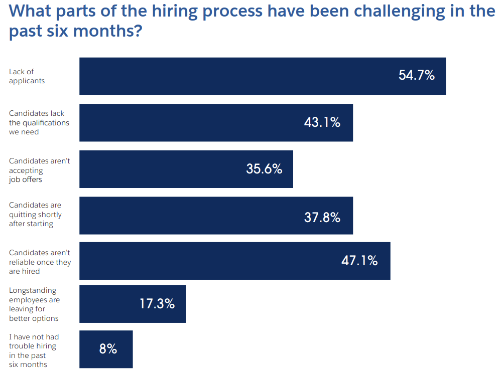 설문에 응답한 중소기업 리더의 거의 절반이 '특정 인력 충원(specific staffing challenge)'에 어려움을 겪고 있다고 답변했다. 채용과정에서 겪은 어려움을 묻는 설문에는 ▶︎지원자 부족 54.7% ▶︎지원자의 자격 부족 43.1% ▶︎지원자의 채용 제안 거절 35.6% ▶︎채용 후 곧바로 퇴사 37.8% ▶︎지원자를 일단 고용하고 나면 신뢰할 수 없음 47.1% ▶︎더 좋은 조건으로 이직하는 오래 근무한 직원 17.3%이라고 답변했다.