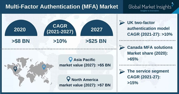 다단계 인증 시장 규모가 2021년에서 2027년까지 연평균 10% 성장할 전망이다. 2020년 80억 달러 이상이었던 시장 규모는, 2027년에 250억 달러 이상이 될 것으로 추정된다. 높은 인터넷 보급률과 사물인터넷(IoT)의 확산으로 네트워크로 연결되는 인프라가 증가하면서, 이를 악용한 사이버 공격이 갈수록 증가하는 것이 시장 성장을 견인하는 주요 요인 중에 하나다.