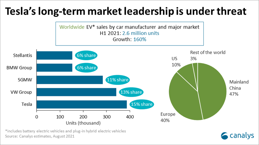 전 세계 전기 자동차 시장은 테슬라가 15%의 시장 점유율로 1위를 달리며, 그 뒤를 폭그바겐 그룹(13%), SGMW(11%), BMW 그룹(6%), 스텔란티스(6%)가 따라가고 있다. 전 세계 전기 자동차 시장은 중국 본토가 47%, 유럽이 40%, 미국 시장이 10%를 차지하고 있다. (자료:Canalys)