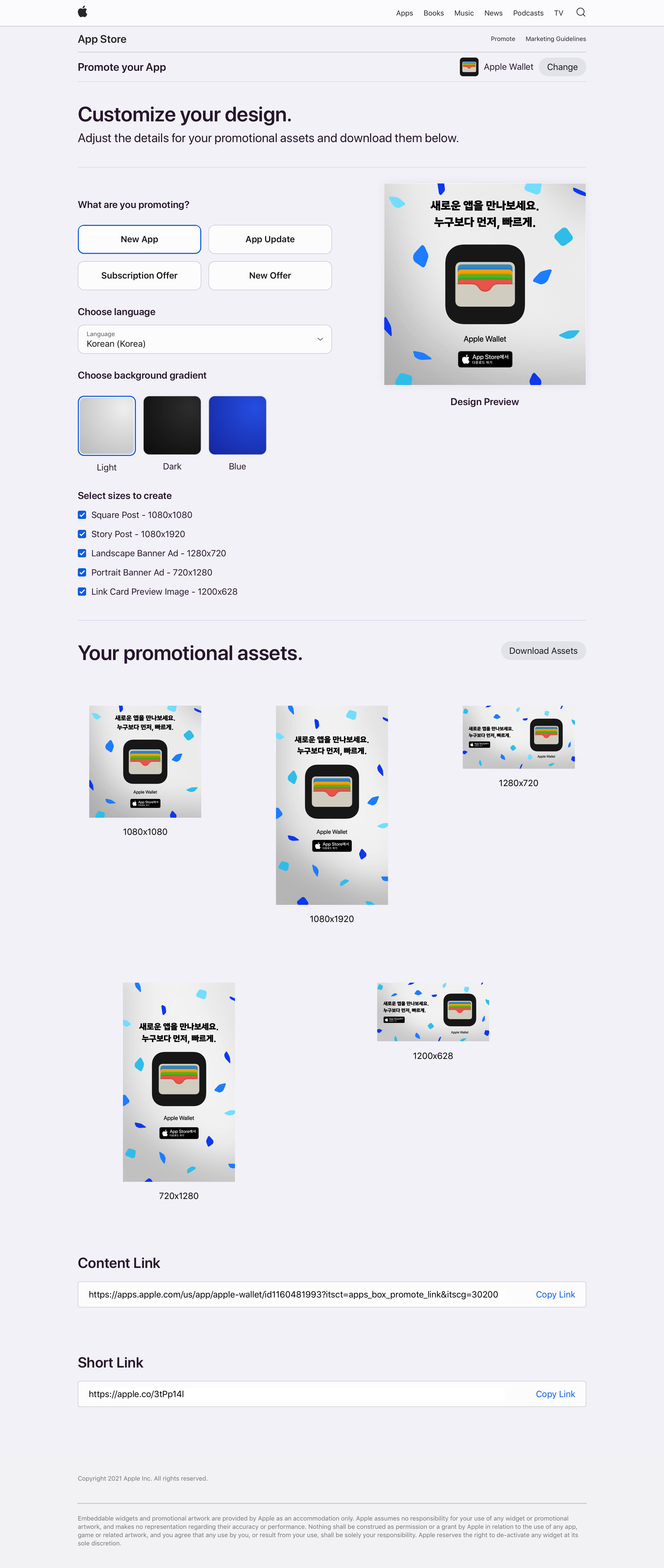 새로운 앱을 앱 스토어에 등록한 후 홍보하고 싶을 때는 물론이고, 업데이트 안내, 구독 안내 그리고 새로운 변경 사항 등이 있을 때 앱 스토어 홍보 도구를 활용할 수 있다. 템블릿 페이지에서 홍보 내용, 언어, 배경, 배너 크기 등을 차례로 선택하면, 디자인 미리 보기를 통해 생성될 배너를 미리 확인할 수 있다. 또한 콘텐츠 링크 또는 짧은 링크를 생성해서 사용하는 것도 가능하다.
