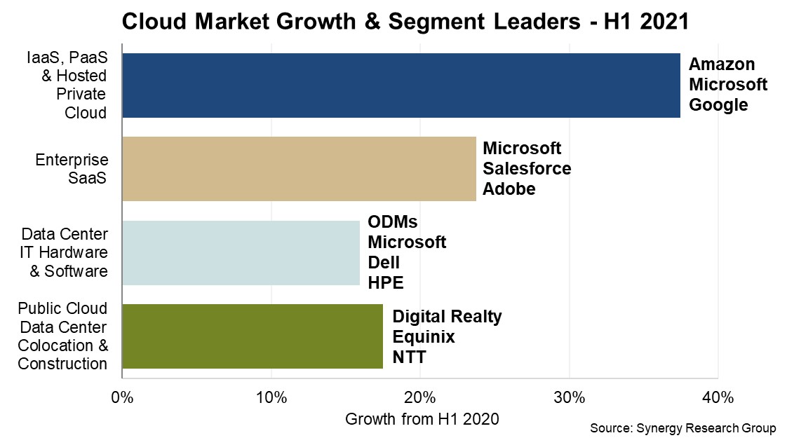 시너지 리서치 그룹은 "이들 업체 중에서 마이크로소프트, 아마존, 세일즈포스, 델, 구글, IBM의 성장이 눈에 띈다. 아울러 시스코(Cisco), 어도비(Adobe), 오라클(Oracle), 브이엠웨어(VMware), SAP, HPE, Alibaba 등의 약진도 주목할만하다. 이들 업체들의 수익의 전체 클라우드 관련 수익의 절반 이상을 차지한다"고 밝혔다.