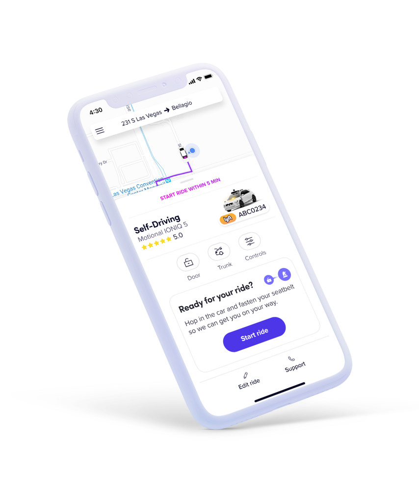 모셔널과 리프트가 2023년 미국 라스베이거스에서 현대자동차의 아이오닉 5 기반의 로보택시를 활용한 완전 무인 차량 공유 서비스를 출시한다고 발표했다. 본격적인 상용 서비스가 개시되면 리프트의 앱을 통해 자율운행 공유차량을 호출하고 탑승하게 된다. (자료:Lyft)