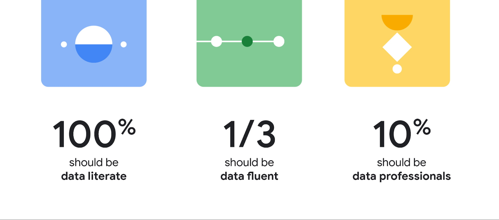"회사 직원들은 100% 모두가 '데이터 활용 능력(data literate)'을 갖추어야 한다. 그중에 1/3은 데이터 활용에 능숙(data fluent)해서, 데이터를 기반으로 한 결과를 분석하고 이를 제시할 수 있어야 한다. 그리고 직원의 10%는 데이터에서 가치를 창출하기 위해 급여를 받는 '데이터 전문가(data professionals)'로 구성해야 한다."
