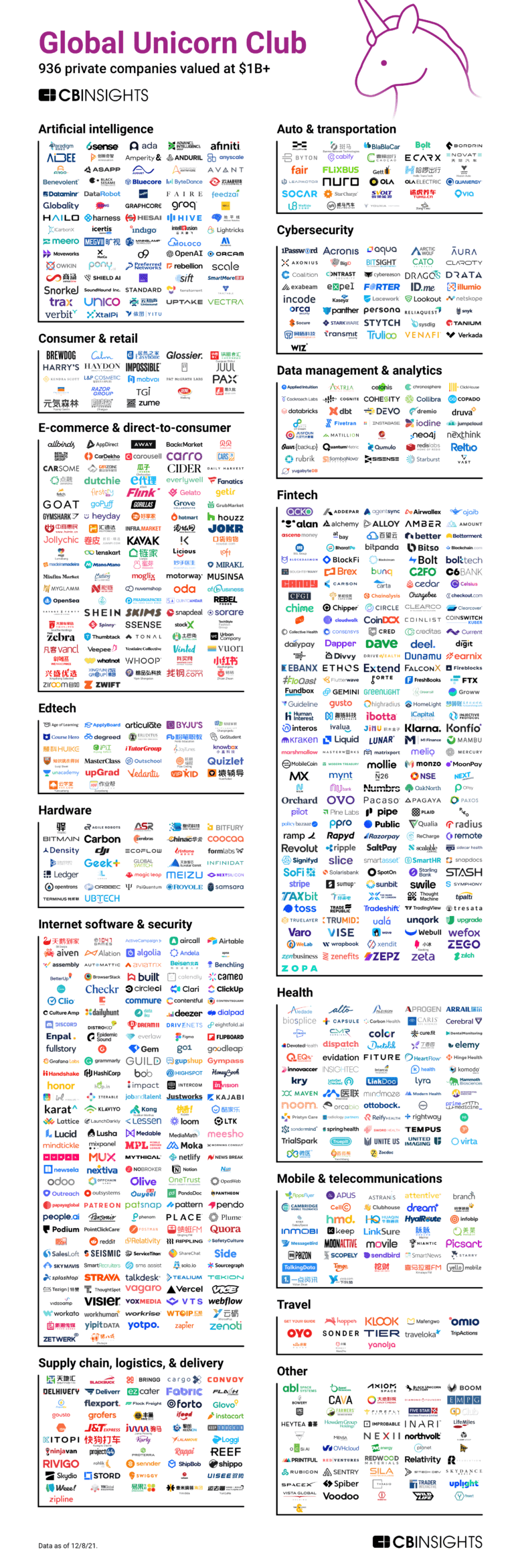 '글로벌 유니콘 클럽(Global Unicorn Club)'이라는 이름표가 붙은 인포그래픽은, 전 세계 유니콘 기업을 자동차 및 교통, 소비자 및 소매, 사이버 보안, 데이터 관리 및 분석, 건강, 모바일 및 통신, 여행, 공급망 및 물류와 배송 등 15개 분야로 나누고 기업 로고를 배열하는 방식으로 제작됐다. 이번 인포그래픽은 전 세계 유니콘의 이름, 기업 가치, 설립일, 산업 분야, 국가 등의 정보를 제공하는 시비인사이츠의 '유니콘 기업 목록(The Complete List Of Unicorn Companies)'이 기준이 됐다.