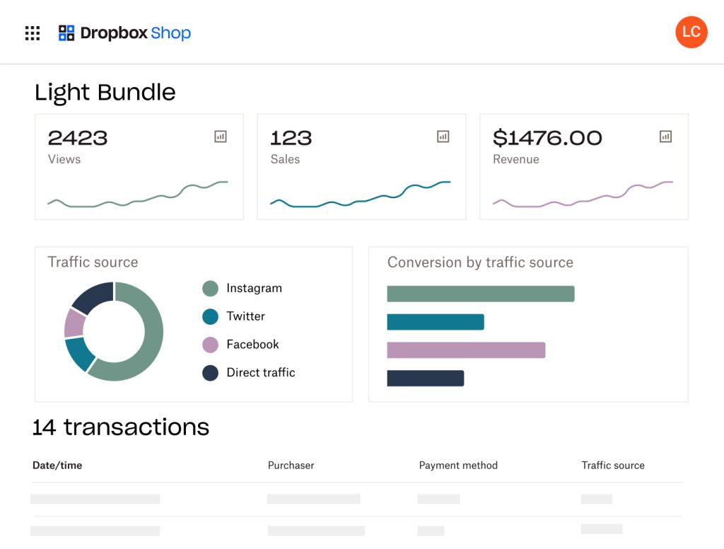 드롭박스 숍에 개설한 상품 링크를 소셜 미디어, 이메일, 블로그, 홈페이지 등 다양한 곳에 첨부할 수 있다. 결제는 페이팔(PayPal), 스트라이프(Stripe), 구글 페이(Google Pay), 신용 카드를 지원한다고 드롭박스는 밝혔다. 아울러 판매한 콘텐츠 파일에 대한 데이터를 추적하고 확인하는 것도 가능하다. 드롭박스 숍에 등록한 항목에 대한 조회(View), 판매(Sales), 수익(Revenue), 접속 경로, 상세 활동 등의 정보를 확인할 수 있다.