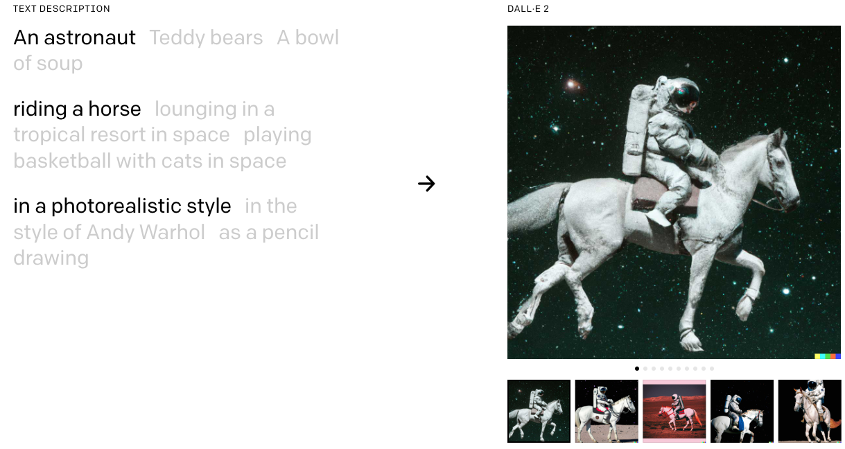 달·이 2에서 '말을 타고 있는 우주 비행사'라고 문자로 입력하면, 실제로 말을 타고 있는 우주 비행사의 모습이 담긴 사진을 만들 수 있다. 이렇게 생성한 사진은 편집, 변형이 가능하고, 누구나 자유롭게 사용할 수 있다. 달·이 2는 현재 베타서비스 기간으로 사용을 하려면 먼저 대기자 명단에 등록을 해야한다. 등록 후 초대장을 받으면 실제로 인공지능을 활용한 이미지 서비스를 활용할 수 있다.