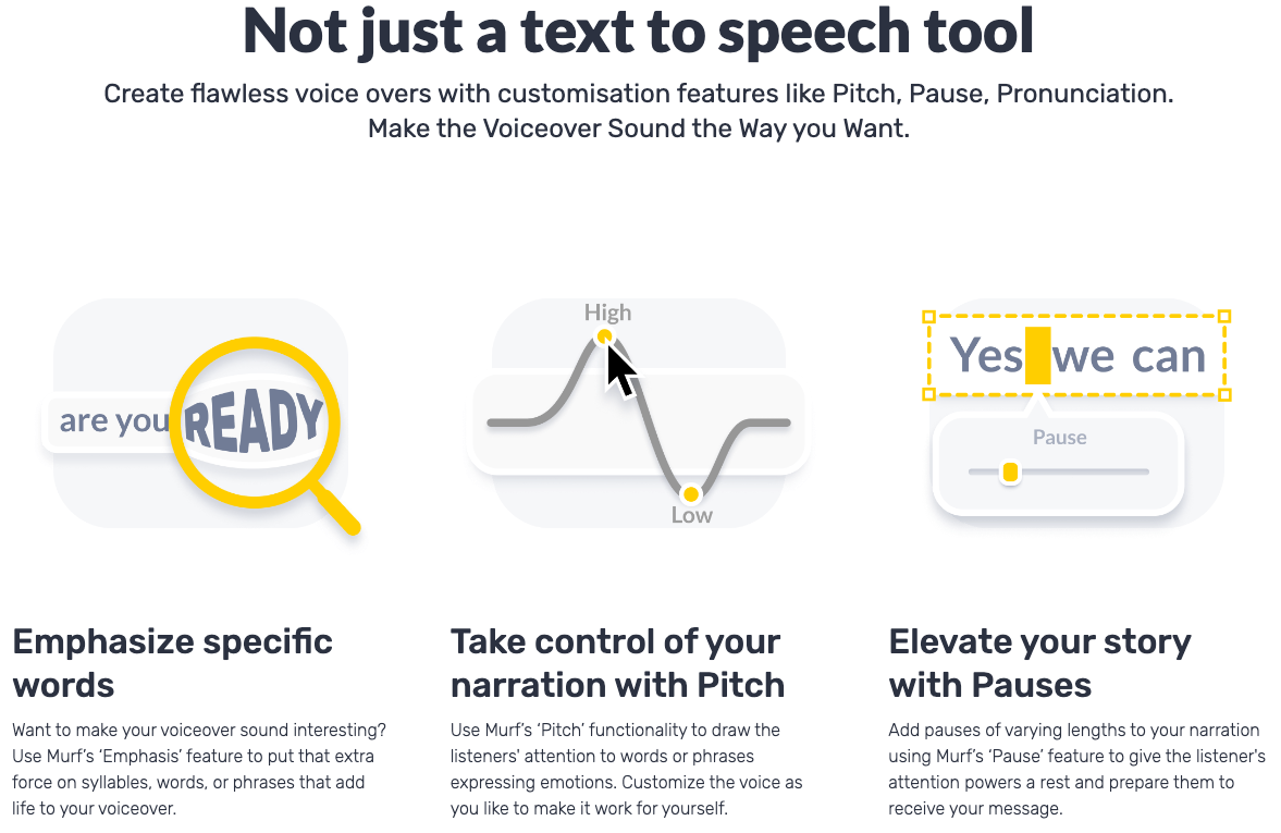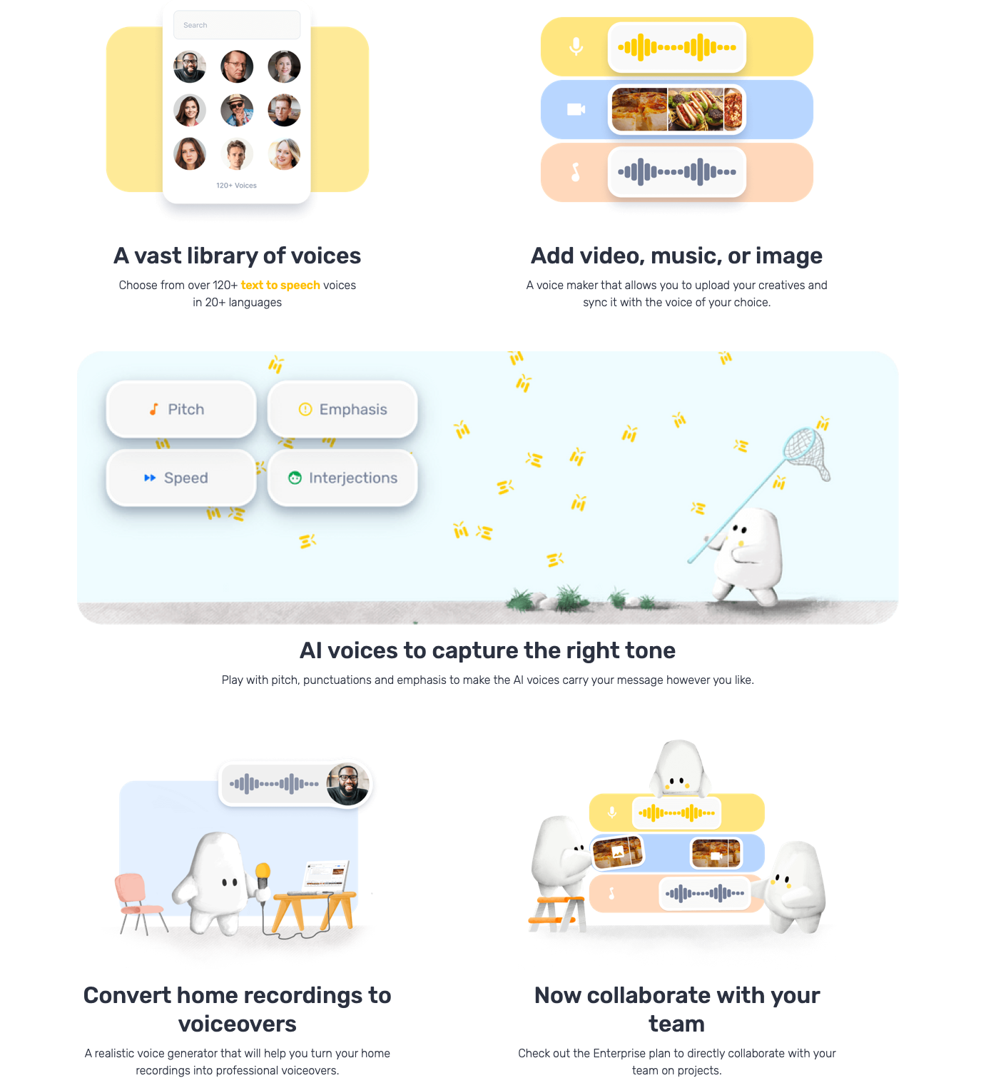 머프.에이아이가 제공하는 인공지능 목소리는 단순하게 문서를 음성으로 변환해 주는 수준을 넘어선다. 사람의 목소리 원본을 제공하면, 이를 감정까지 모방하는 다양한 캐릭터의 음성으로 변환해서 사용할 수 있는 음성 복제, 동영상 파일에 빠르고 간편하게 음성으로 된 해설을 넣을 수 있는 보이스 오버 비디오(Voice Over Video), 직접 녹음한 음성을 인공지능 목소리로 변환할 수 있는 보이지 체인저(Voice Changer) 등이 있다.