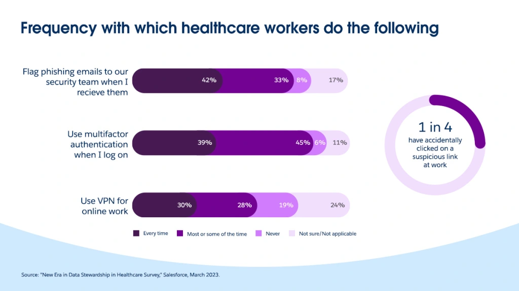 세일즈포스(Salesforce)가 400명의 의료 종사자를 대상으로 데이터 보안과 안전 의식을 알아보는 설문 조사를 진행했다. 결론은 생각 따로 행동 따로인 상태, 머리는 아는데 몸은 행동하지 않는, 보안 의식과 현실의 격차가 크다는 것이다. 조사 대상자의 75%는 데이터를 안전하게 보호하는 것이 자신의 책임이라고 생각하고 있는지만 실제로 이를 실천하는 경우는 훨씬 적은 것으로 드러났다.
