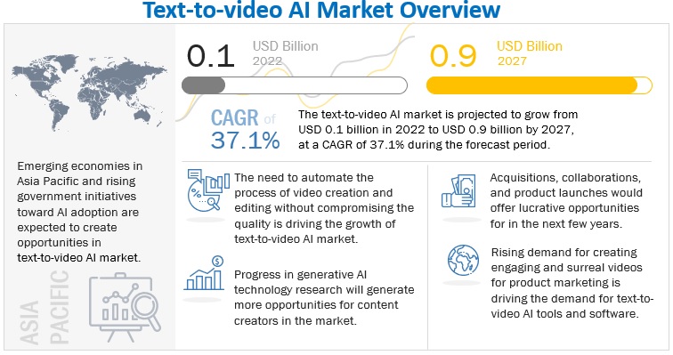 글로벌 '문자-비디오 변환 AI' 시장 규모가 2027년까지 37.1%의 성장률을 기록하며 초고속으로 성장할 전망이다. 2022년 1억 달러로 추정되는 시장 규모는 2027년에 9억 달러 규모로 급성장할 것으로 예상된다. 비디오가 고객 참여 및 유지율을 높이는 중요한 도구로 자리 잡으면서, 기업에서의 비디오 수요가 증가가 시장 성장할 주도할 것으로 보인다.