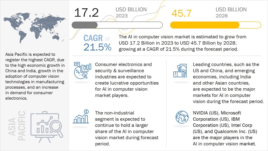 마켓앤마켓(MarketsandMarkets)의 '2028년까지 컴퓨터 비전 산업에서의 AI 전망(AI In Computer Vision Market - Global Forecast to 2028)' 보고서는 자동화 및 효율성에 대한 증가가 컴퓨터 비전 시장에서 AI 성장의 핵심 동력이 될 것이라고 밝혔다. 보고서는 컴퓨터 비전 분야의 AI 시장을 구성 요소(하드웨어, 소프트웨어), 기능(훈련, 추론), 애플리케이션(산업, 비산업), 최종 사용자, 지역 등으로 나누어 분석했다.