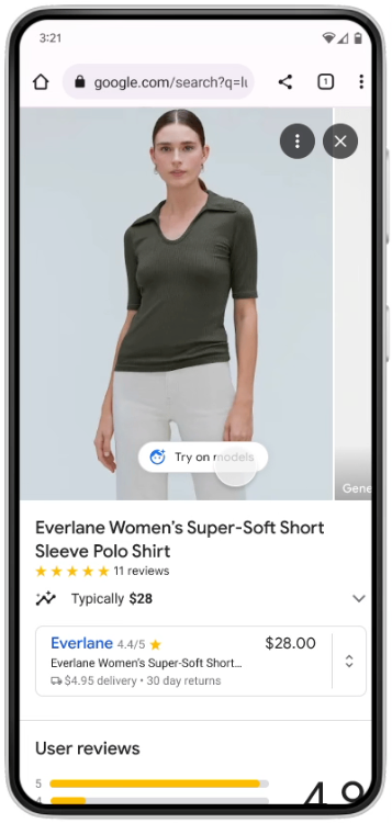 온라인에서의가상피팅서비스는우선미국고객부터적용한다.구글에입점한앤쓰로폴리지(Anthropologie),에버래인(Everlane),H&M,로프트(LOFT)등의브랜드여성복상의를생성AI가제공하는서비스를통해입은모습을확인할수있다.미국고객이라면검색에서'입어보기'배지가있는제품을선택한후모델을지정하면된다.가상피팅서비스는제품및판매자데이터세트인쇼핑그래프와함께제공한다.