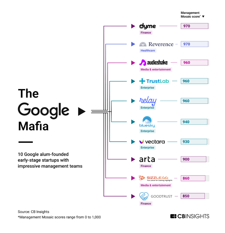 CB인사이츠(CB Insights)가 '전직 구글 직원이 설립한 스타트업 10(1,200+ startups founded by ex-Googlers — and the 10 you should know about)'을 발표했다. 자체적으로 개발한 창업 기업의 경영진 역량을 평가하는 모자이크(Mosaic) 알고리즘을 기반으로, 전직 구글 직원이나 임원이 창업한 스타트업 중에서 주목할만한 기업 10개를 추린 것으로, 아래와 같이 요약해서 소개한다.