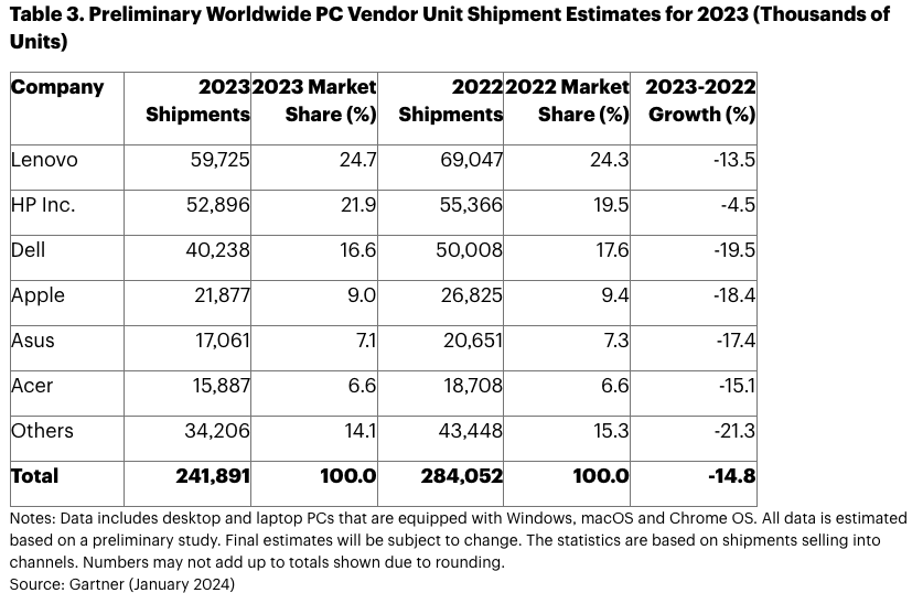 가트너(Gartner)가 '2023년 4분기 전 세계 PC공급업체의 예비 출하량(Preliminary Worldwide PC Vendor Unit Shipment Estimates for 4Q23)'를 발표하고, 전 세계 PC 시장이 8분기 연속 하락세를 기록한 이후 회복 조짐을 보이고 있다고 밝혔다. 2023년 4분기 상위 6개 공급업체의 순위 변동은 없었지만 4개 업체는 전년 대비 성장하고 2개 업체는 하락을 기록했다. 이번 발표는 예비 결과로 최종 통계는 조만간 발표할 예정이다.
