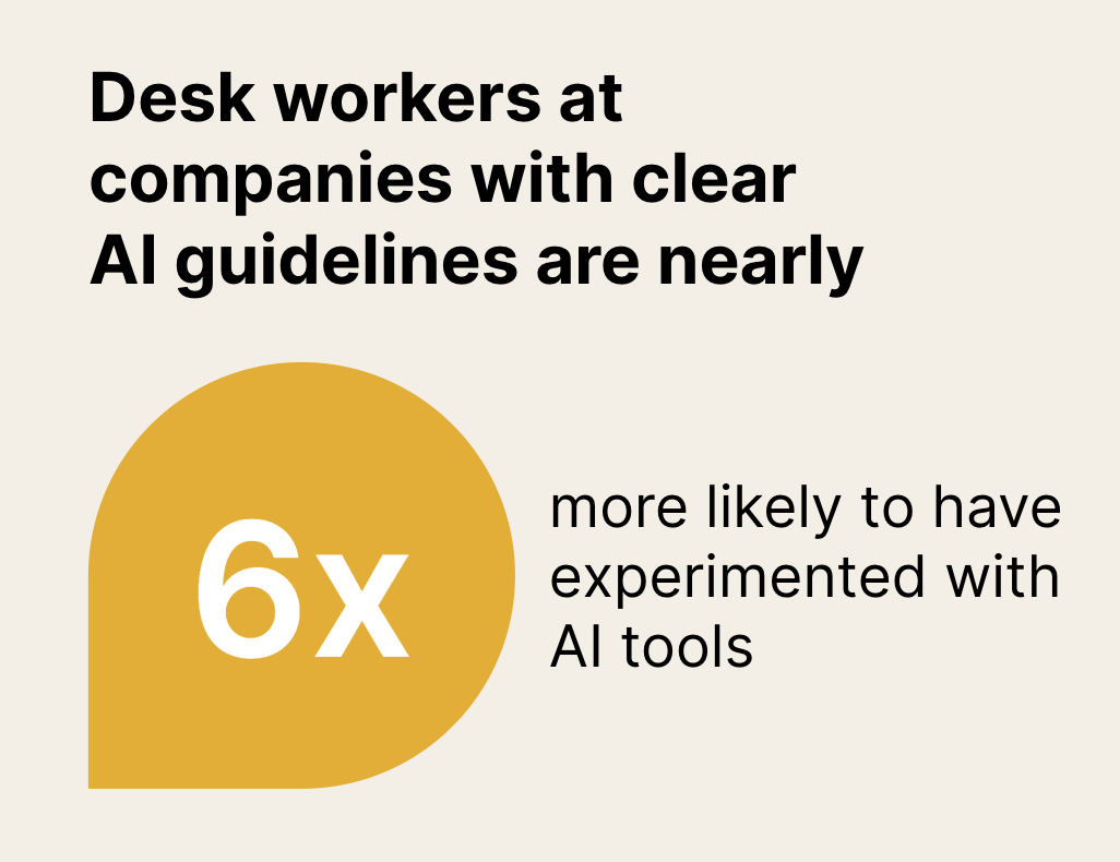 이번 설문 조사에서 AI 가이드라인이 정의되어 있는 회사의 사무직 근로자는 AI 사용 가이드라인이 없는 회사의 사무직 근로자에 비해 AI 도구를 사용해 본 경험이 있는 비율이 거의 6배나 높았다. AI 사용을 제한하는 회사의 직원들도 AI 사용 관련 가이드라인이 없는 회사의 직원에 비해 AI 도구를 실험해 본 경험이 있을 가능성이 더 높은 것으로 나타났다.