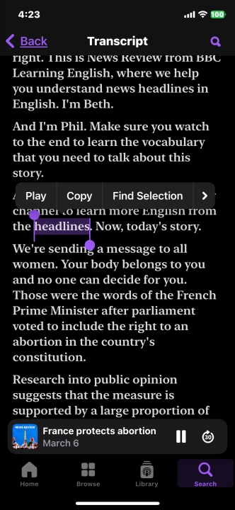 특히, 재생되는 오디오 내용을 따라 해당 부분의 텍스트를 표시하며 따라가는 기능은 팟캐스트를 외국어 학습용을 활용하는 사람들에게 유용하다. 예를 들어 "It's March now."라는 부분이 오디오에서 재생되고 있다면, 텍스트 스크립트에서 현재 재생되는부분을 따라가며 'It's March now' 부분이 굵은 글씨체로 강조되며 표시된다.
