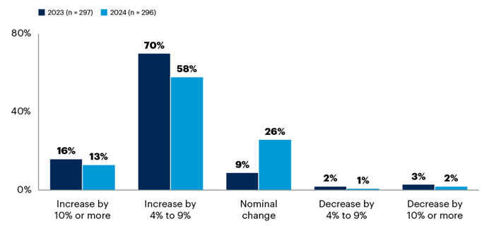 평균 직원 보수에 대한 변경 계획 내용을 보면, 10% 이상 인상할 계획이라고 답변한 경우가 13%를 차지했다. 동일한 질문에 16%가 인상 계획이 있다고 답변한 2023년과 비교하면 3% 줄어든 것이다. 58%의 CFO는 평균 4~9%의 인상 계획을 가진 것으로 답변해 가장 많았다. 역시 동일한 설문에 대해 2023년에는 70%가 인상할 계획이라고 답변했었다.
