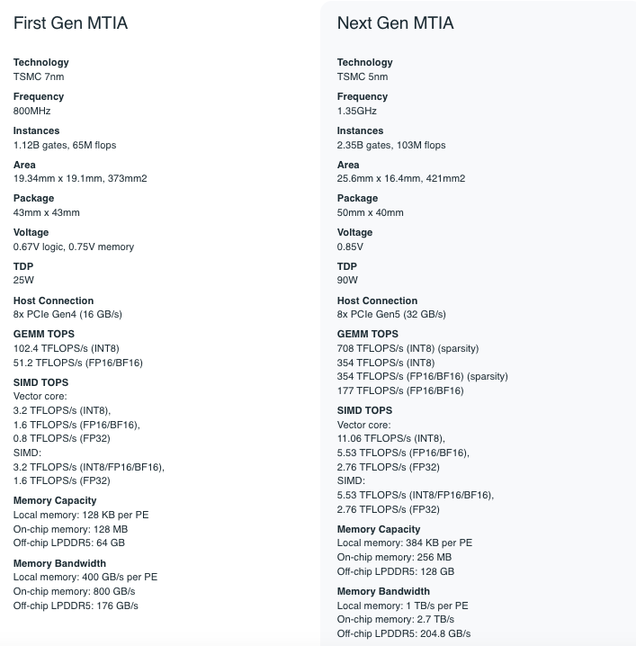 차세대 MTIA는 TSMC의 5nm(나노미터) 기술을 적용해, 7nm 기술을 사용했던 1세대 보다 한 단계 진화했다. 동작 속도는 1.35GHz로 1세대의 800MHz 보다 빨라졌고, 대역폭을 늘리면서 짧은 지연 시간으로 여러 PE 간에 조율할 수 있는 향상된 네트워크 온 칩(NoC) 아키텍처를 특징으로 한다.