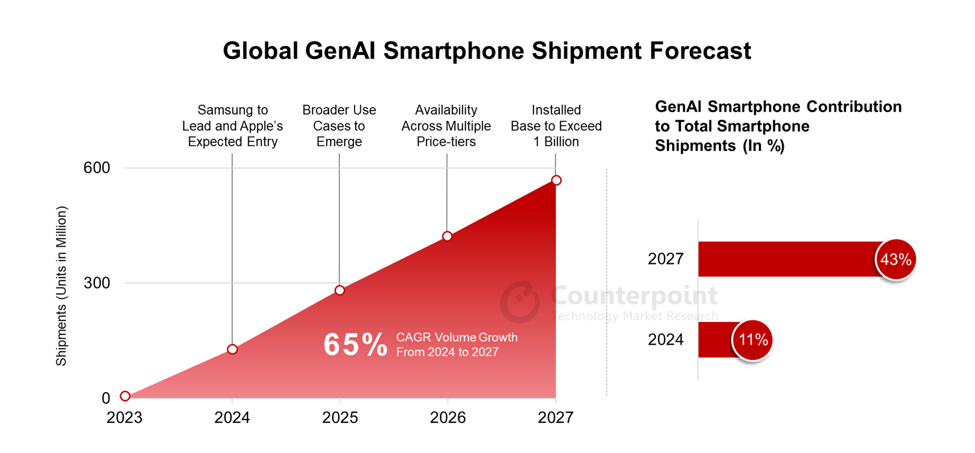 전체 스마트폰 출하량 중에서 생성형 AI 지원 스마트폰(GenAI-capable Smartphone, 이하 AI 스마트폰)이 차지하는 비율이 2024년 11%에서 2027년에는 43%까지 증가할 전망이다. AI 스마트폰 시장에서 2024년에는 삼성이 2025년에는 애플이 선두 자지를 차지할 것으로 예상된다.