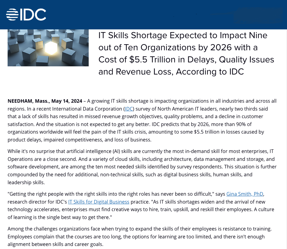 IDC(International Data Corporation)가 2026년까지 IT 기술 부족으로 인한 제품 지연, 경쟁력 저하, 수익 손해로 인한 손실 비용이 5조 5,000억 달러에 달할 것으로 예상했다. 이러한 문제를 해결하려면 효과적인 학습 환경을 조성할 수 있는 전략과 문화 변화 등 그 이상의 조치가 필요하다고 강조했다.