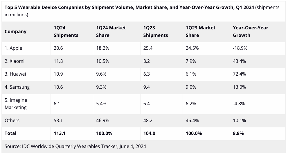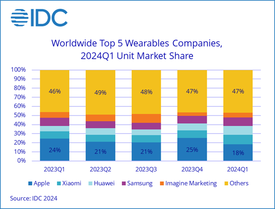 웨어러블 장치 시장의 상위 5개 기업 중에서 1위를 달리고 있는 애플(Apple)은 2023년 1분기와 비교할 때 시장 점유율과 전년 대비 성장률 모두 큰 폭으로 하락했다. 2023년 1분기 2,540만 대에 달하던 출하량은 2024년 1분기 2,060만 대로 내려가면서 연간 성장률이 -18.9%로 크게 떨어졌다. 시장 점유율도 2023년 1분기 25.4%에서 2024년 1분기는 18.2%까지 내려갔다.