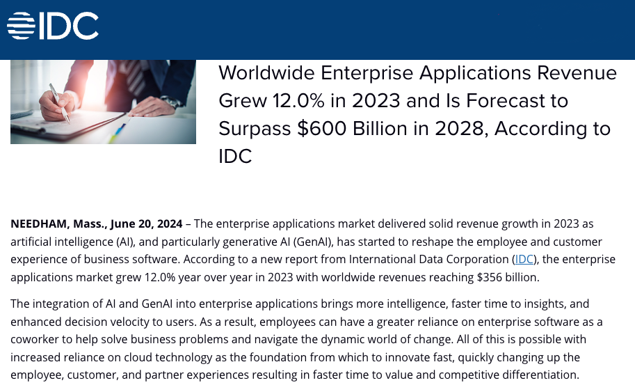 IDC(International Data Corporation)가 ‘2023년 전 세계 엔터프라이즈 애플리케이션 소프트웨어 시장 점유율(Worldwide Enterprise Applications Software Market Shares, 2023)’ 보고서를 발표했다. 보고서는 AI 및 생성형 AI 뿐만 아니라 디지털 혁신을 위한 새로운 도구에도 지속적인 투자를 이어갈 것이라고 밝혔다.