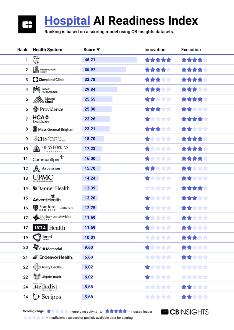 AI 혁신으로 가장 앞선 미국 병원은?…CB인사이츠, 혁신과 실행 기반 AI 준비 지수 발표