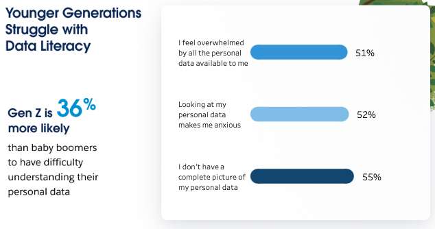 태블로와 세일즈포스와 최근에 실시한 설문조사에서 ‘데이터 폭증(Data Explosion)’으로 적지 않는 사람들이 적지 않은 사람들이 어려움을 겪고 있는 것으로 조사됐다. 설문에 참여한 Z 세대의 51%가 금융 및 의료 정보 등의 모든 개인 데이터에 부담을 느낀다고 답변한 것이다.