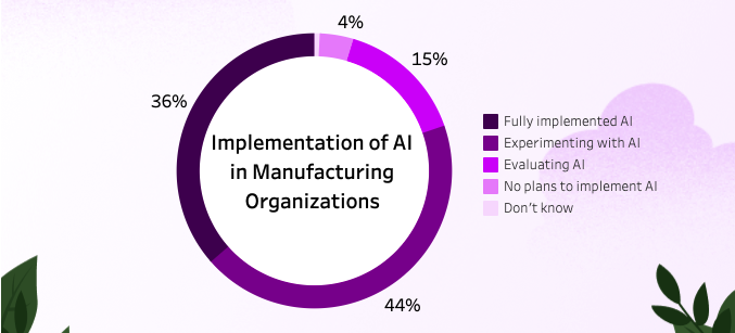 이번 조사에서 가장 주목할 점은 설문 참여자의 85%가 ‘제조업체가 경쟁력 유지하려면 일상 업무를 현대화해야 한다’고 답했다는 것이다. 특히 80%의 응답자는 인공지능을 실험하고 있으며, 36%는 이미 인공지능이 운영에 완전히 구현되었다고 답변했다. 영업, 서비스, 마케팅, 운영 부문에서는 생성형 AI를 콘텐츠 제작 등에 사용하는 것으로 나타났다.