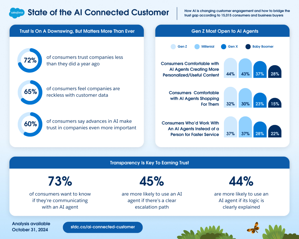 소비자의 약 75%는 자신이 지금 AI 에이전트와 대화하고 있는지 알고 싶어 하고, 45%는 투명한 에스컬레이션 경로(clear escalation path)가 있다면 AI 에이전트를 사용할 가능성이 45% 더 높고, AI 에이전트의 로직이 명확하게 설명되면 AI 에이전트를 사용할 가능성이 44% 더 높은 것으로 조사됐다.