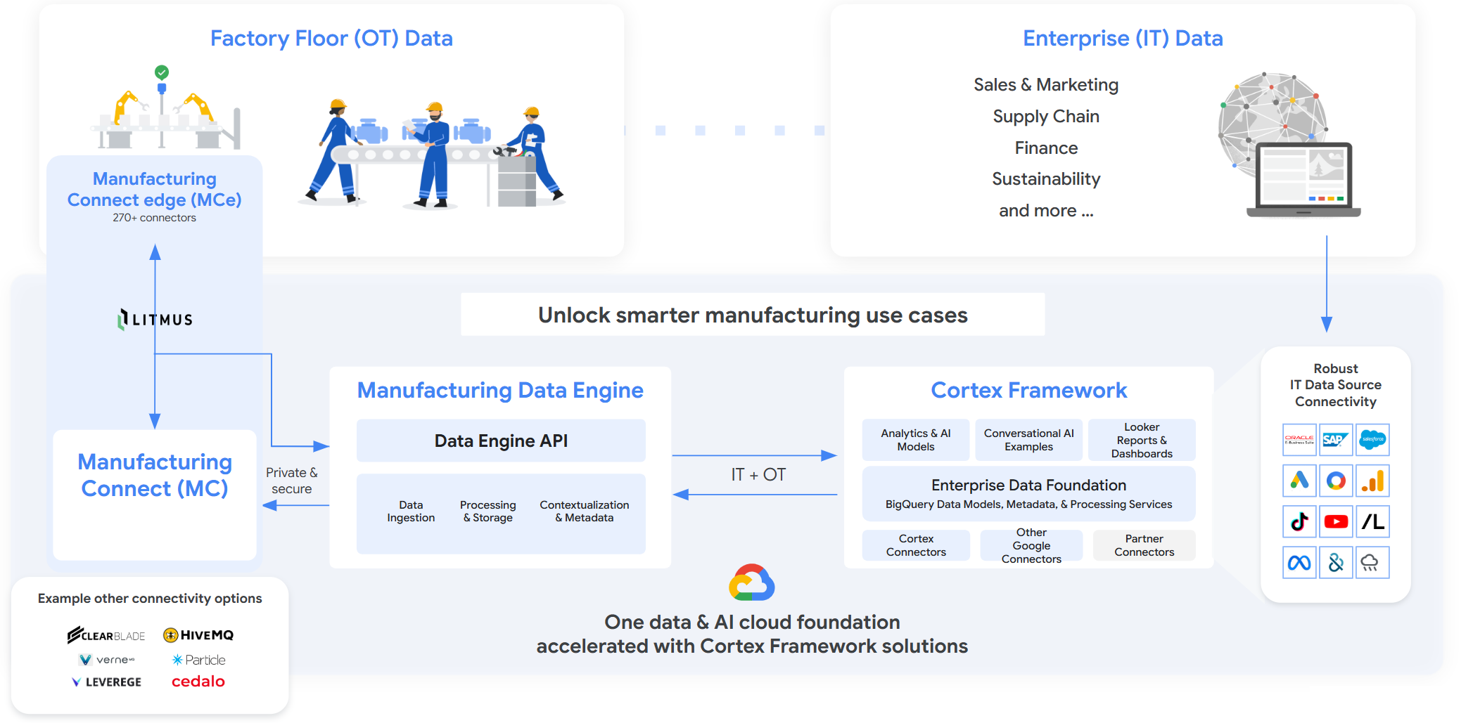 구글 클라우드(Google Cloud)가 MDE(Manufacturing Data Engine)를 활용해 제조업체에서 운영 데이터의 잠재력을 최대한 활용할 수 있는 5가지 방법을 소개했다. MDE는 코텍스 프레임워크(Cortex Framework)를 활용한 똑똑한 데이터 정리 시스템이고, 코텍스 프레임워크는 데이터를 잘 활용할 수 있도록 해주는 일종의 가이드라고 할 수 있다.