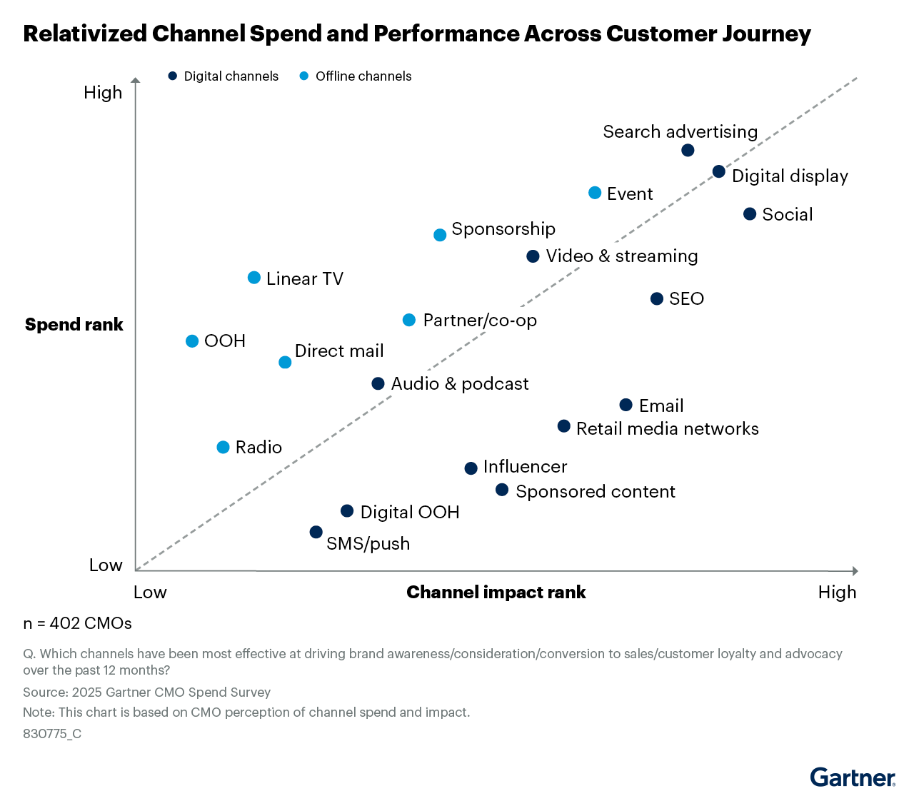 가트너(Gartner)가 ‘2025 CMO 지출 설문조사(2025 CMO Spend Survey)’ 결과를 발표했다. 이번 설문조사에서 10개 산업 중 7개 분야가 마케팅 예산의 60% 이상을 온라인 채널에 할당하고 있으며, 디지털 채널은 전체 마케팅 지출의 61.1%를 차지한 것으로 나타났다.
