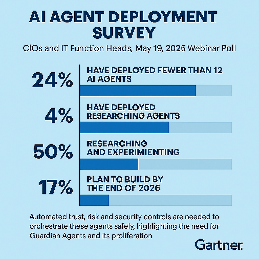 가트너(Gartner)가 가디언 에이전트 기술이 2030년까지 에이전틱 AI 시장에서 최소 10~15%를 차지할 것으로 전망했다. 또한, CIO와 IT 책임자 147명을 대상으로 실시한 웨비나 여론 조사(2025.05.19)을 통해 응답자의 24%는 12개 미만의 AI 에이전트를 배포했고 4%는 12개 이상을 배포한 것으로 나타났다.