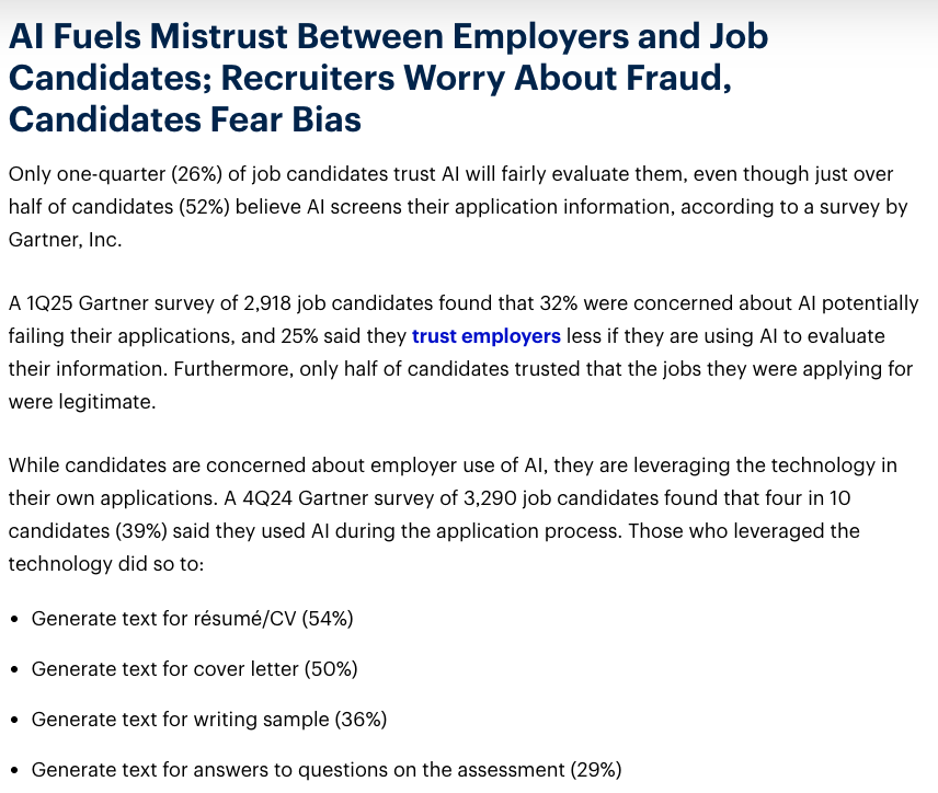 AI에 대한 불신은 구직자들의 행동 패턴에도 변화를 가져오고 있다. 가트너 조사에 따르면 2025년 2분기 기준으로 51%의 구직자만이 최근 지원 과정에서 채용 제안을 수락했다고 답했다. 이는 2023년 2분기의 74%와 비교해 23%포인트나 급락한 수치다.